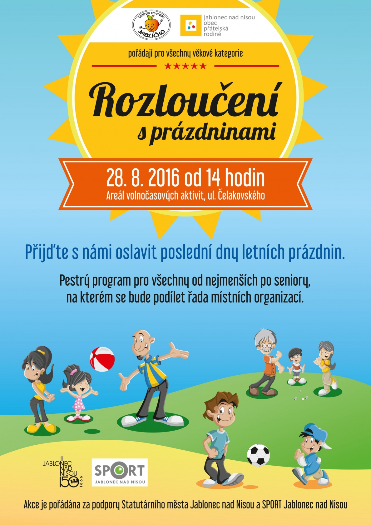 „Sportovní a zábavné odpoledne připravilo město společně s Centrem pro rodinu Jablíčko, Sportem Jablonec nad Nisou, Centrem sociálních služeb a seniorskými kluby, jabloneckými profesionálními hasiči, hokejisty a fotbalistkami. Každý z nich připravil stanoviště, které bude usilovat o pozornost malých i velkých návštěvníků,“ zve do areálu náměstek primátora Pavel Svoboda. Nedělní rozloučení s prázdninami bude probíhat od 14 do 17 hodin, v případě horkého počasí hasiči zabezpečí vodní osvěžení, připravené je i občerstvení na sousedním fotbalovém stadionu.